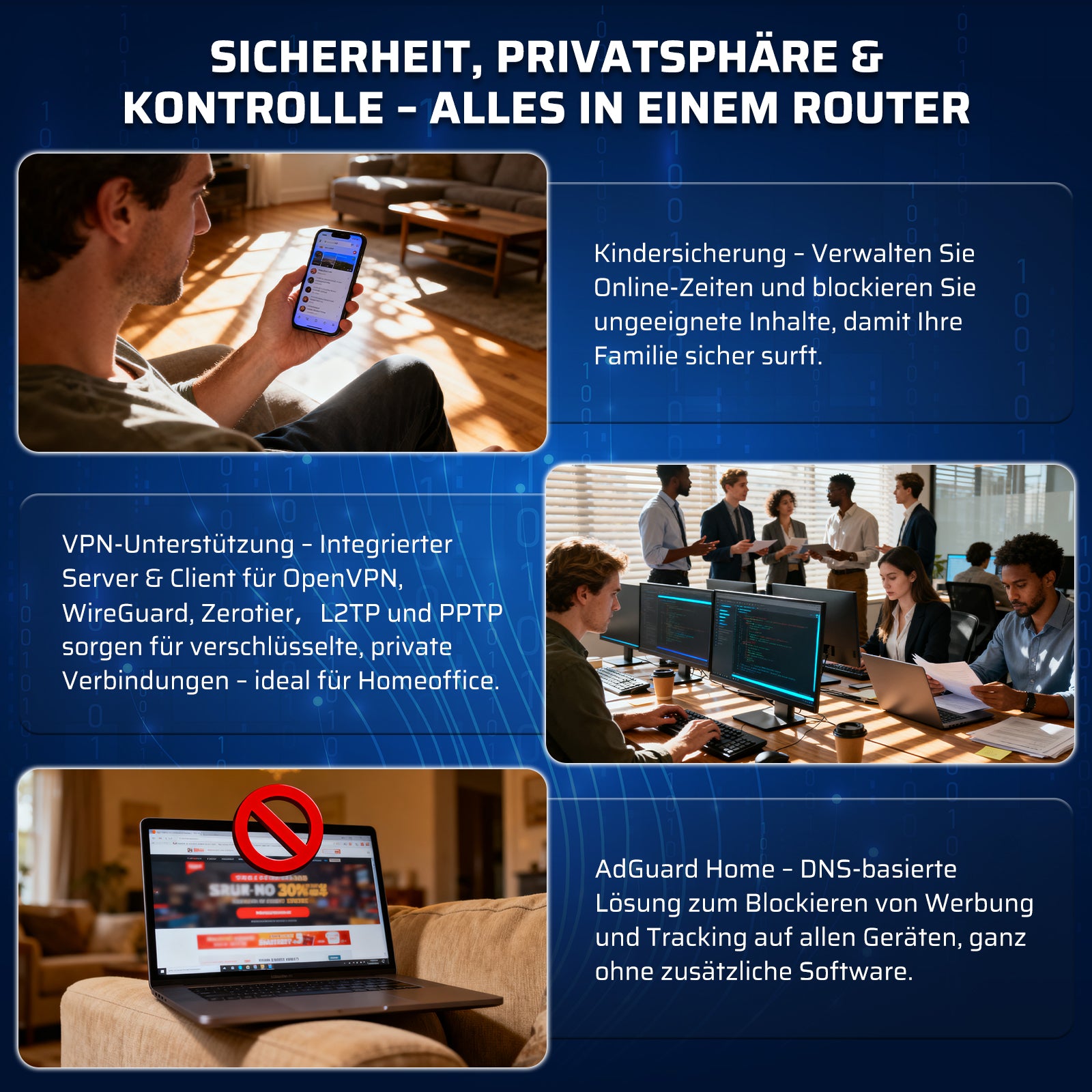 Leistungsstarke VPN-FunktionUnterstützt OpenVPN und WireGuard (über das neueste Firmware-Update) sowie PPTP/L2TP und bietet flexible und sichere Fernverbindungen für Heim- oder Büronetzwerke