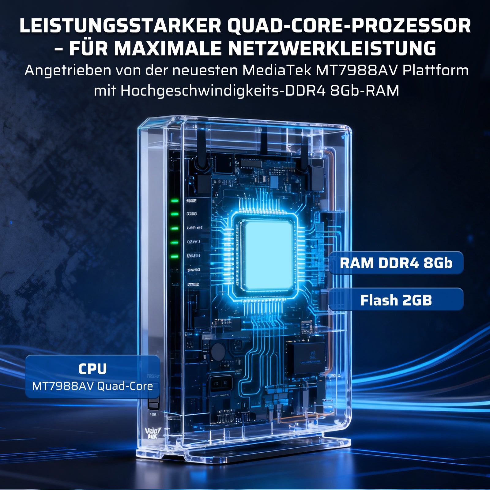 Maximale Reichweite und Performance: Ausgestattet mit 10 optimierten Antennen (2×2.4G, 2×5G, 5×6G, 1×DFS) für stabile, weitreichende Signalabdeckung und angetrieben von der neuesten MediaTek MT7988AV Plattform mit 8GB DDR4-RAM liefert der Router kompromisslose Geschwindigkeit, hohe Verarbeitungskapazität und unterbrechungsfreie Verbindungen im gesamten Smart Home.